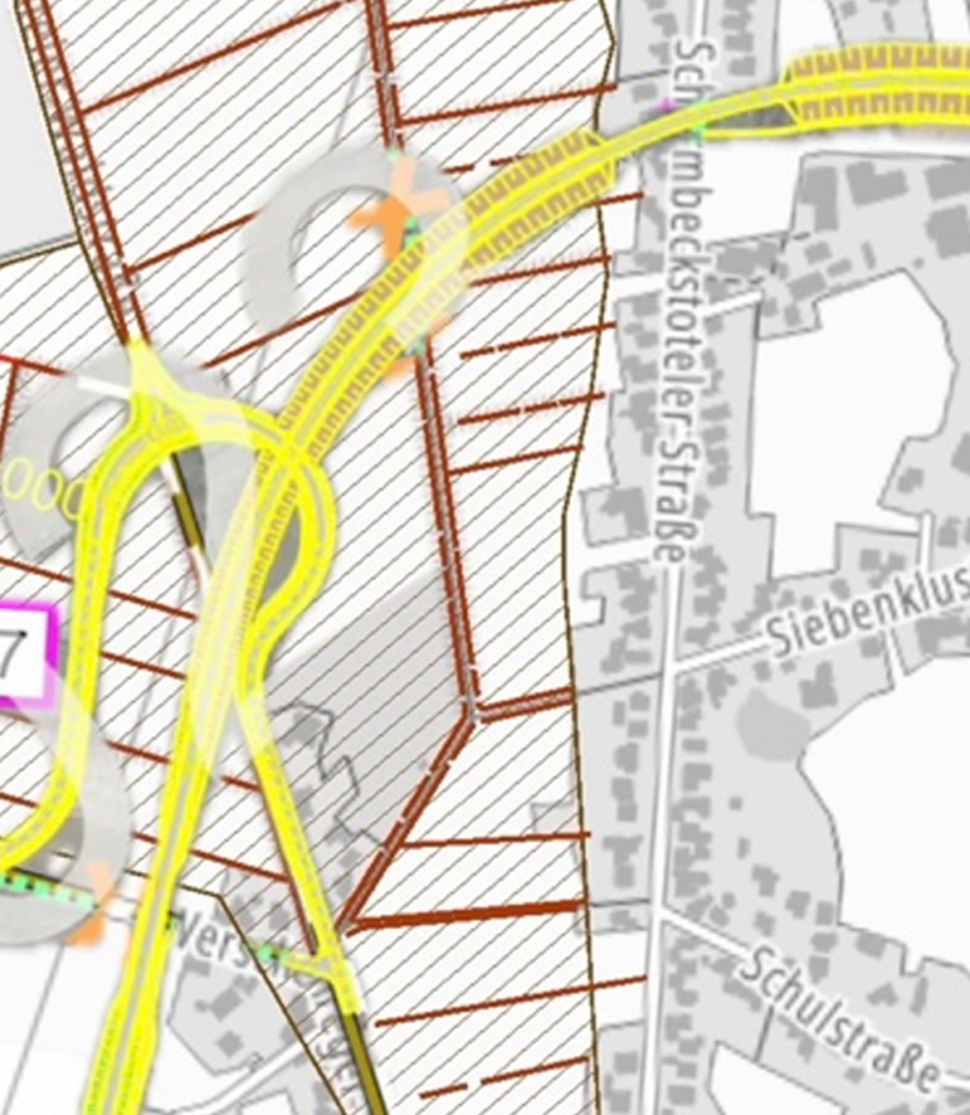 Das ist nur einer der Bereiche, der durch ein riesiges Brückenbauwerk, Abriss und Siedlungs-Zerschneidung gekennzeichnet ist. Sehen Sie sich bitte die anderen Bereiche längs der West-Variante auch an…